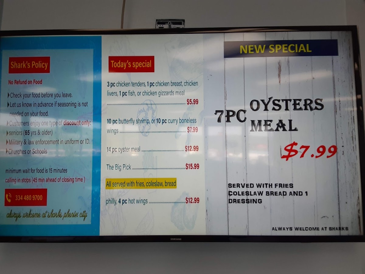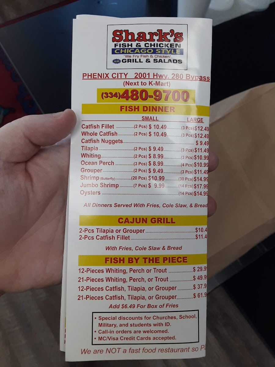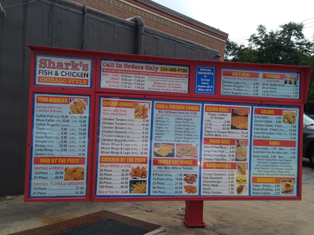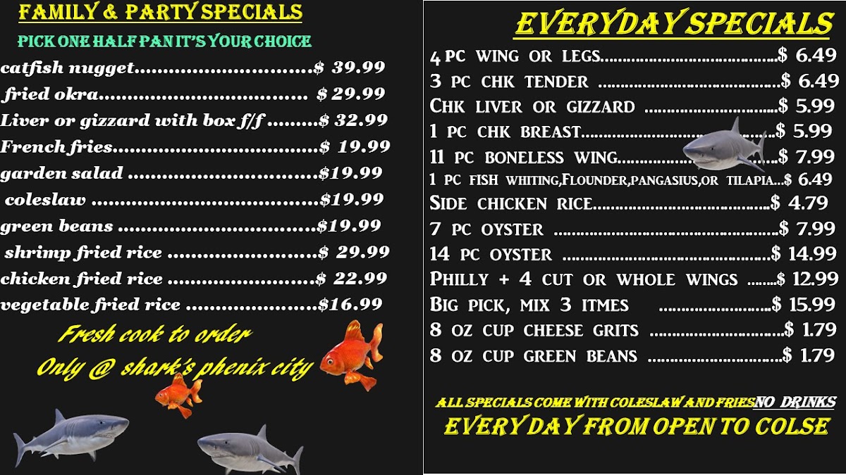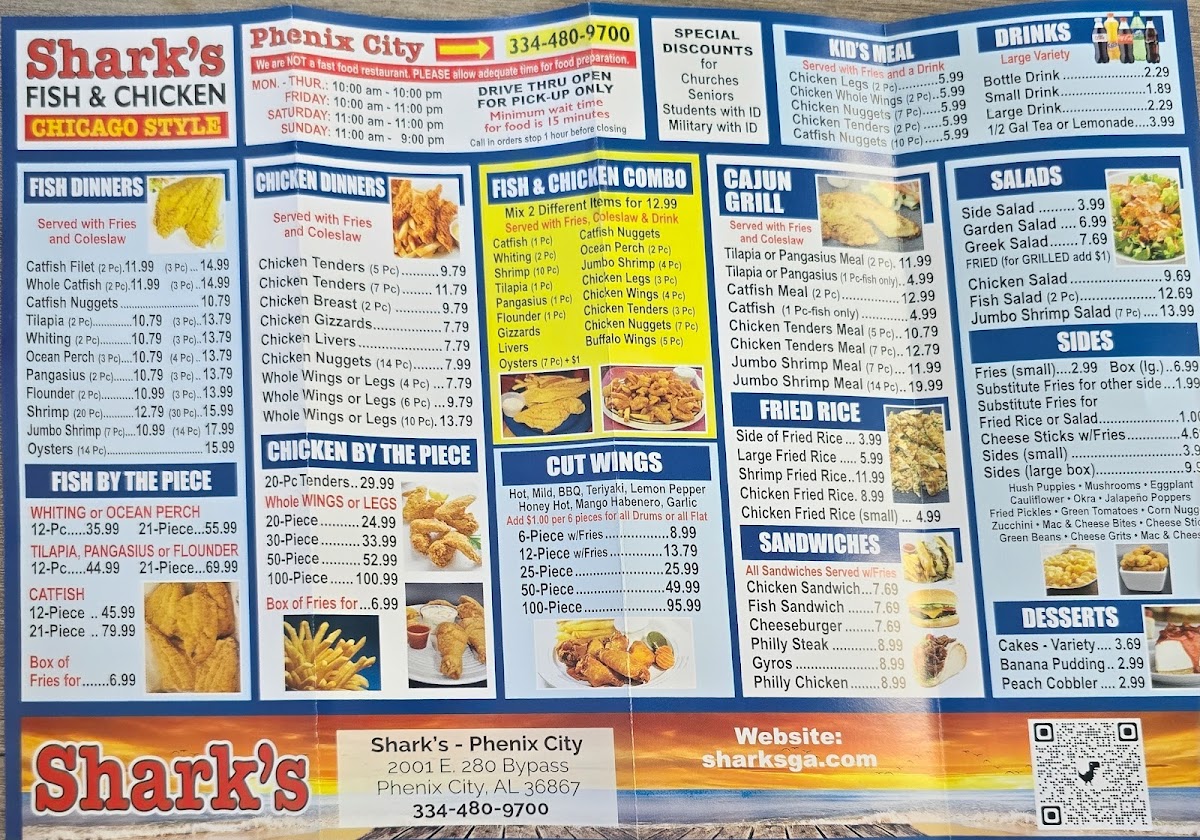 If you're in the mood for a mouthwatering combination of crispy fried fish, juicy chicken, and classic sides, look no further than Sharks Fish & Chicken - Phenix City, Alabama Menu. Located at 2001 E 280 Byp, Phenix City, AL 36867, this spot has become a local favorite for satisfying cravings with its diverse menu options. Whether you're stopping by for a quick bite or planning a family meal, the menu has something for everyone. From tender fried fish fillets to perfectly seasoned chicken wings, every dish is prepared with care to ensure the highest quality and flavor. Sides like fries, coleslaw, and hushpuppies perfectly complement the main dishes, making it an all-around satisfying meal. It's a place where comfort food is always served hot and fresh, perfect for any day of the week.